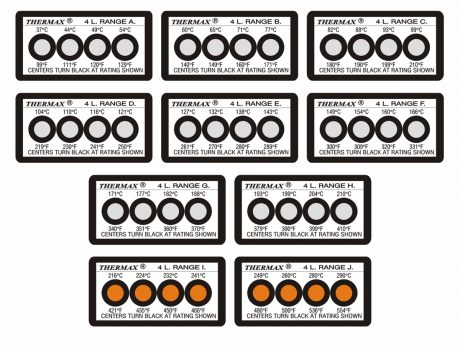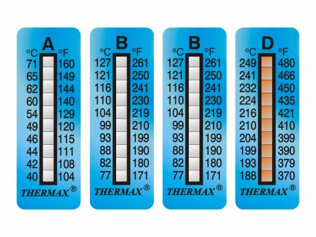 We present the full range of Thermax strips with different temperature levels. These Thermax strips \ tapes change their color permanently, indicating the maximum temperature reached and can be used in most of the applications where temperature is an important factor. The Thermax tape system is a quick and easy temperature monitoring system based on patented color changing technology.
