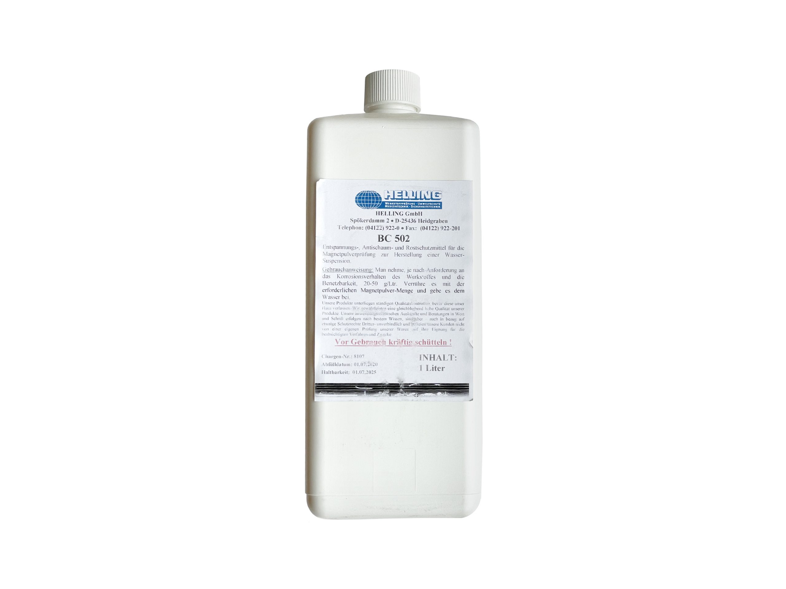 Additive BC502 – a composition of water, amine borate, anionic and nonionic surfactants. It is used as wetting (surface-active), antifoam and corrosion-preventive agent for preparation of waterbased magnetic particle suspensions. Dosage: 20-50 ml per 1 L of ready-to-use water-based magnetic particle suspension.