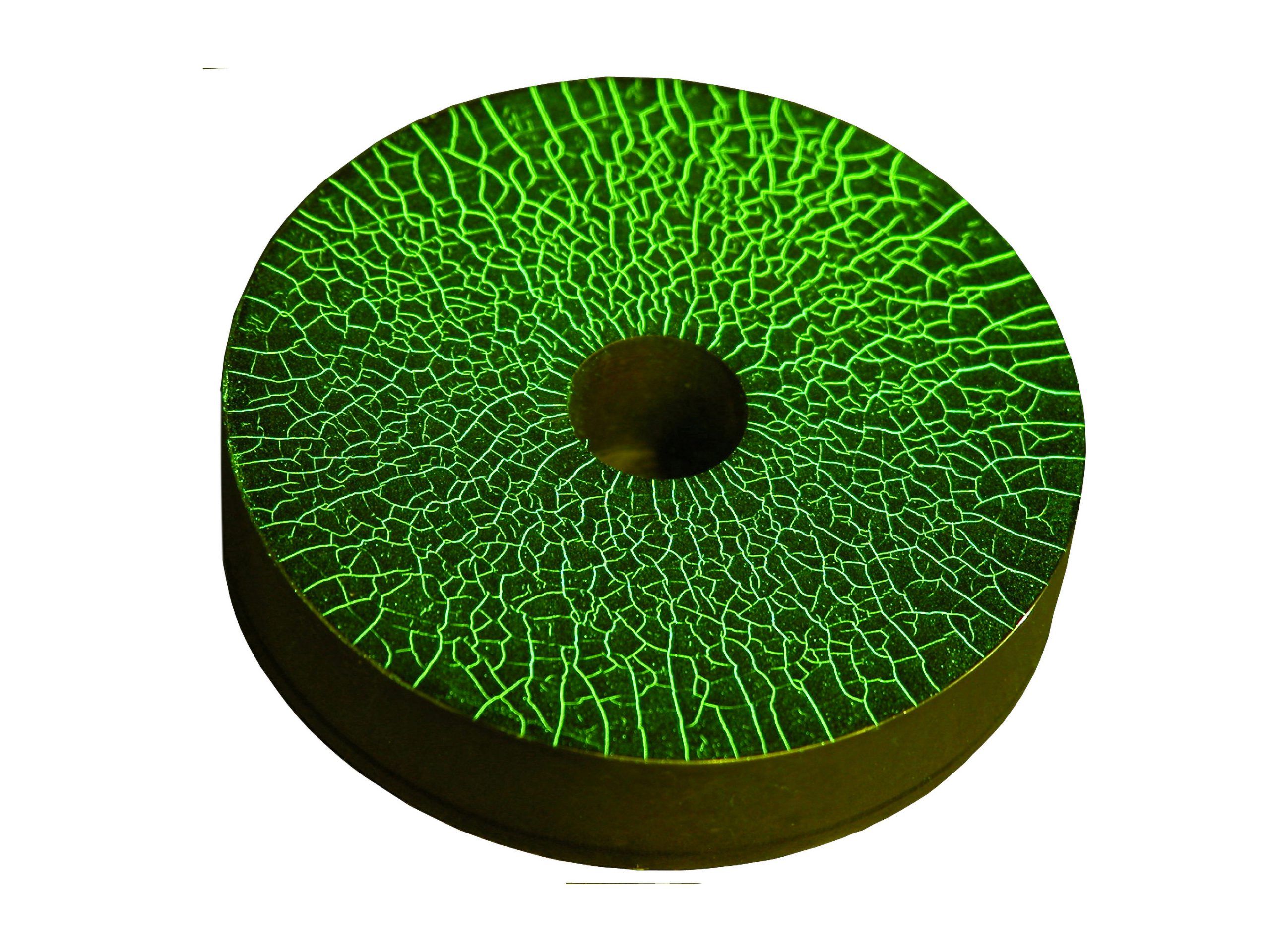 Reference Block No.1 (DIN EN ISO 9934-2) – Remanent magnet (90MnCrV8, 50 mm x 10 mm) with rough grinding cracks and fine stress corrosion cracks. Differently strong flux leakages appear over the cracks caused by the magnetic field of the remanent reference body. The more sensitive the test product, the more clear and contrasty the crack indications will appear.