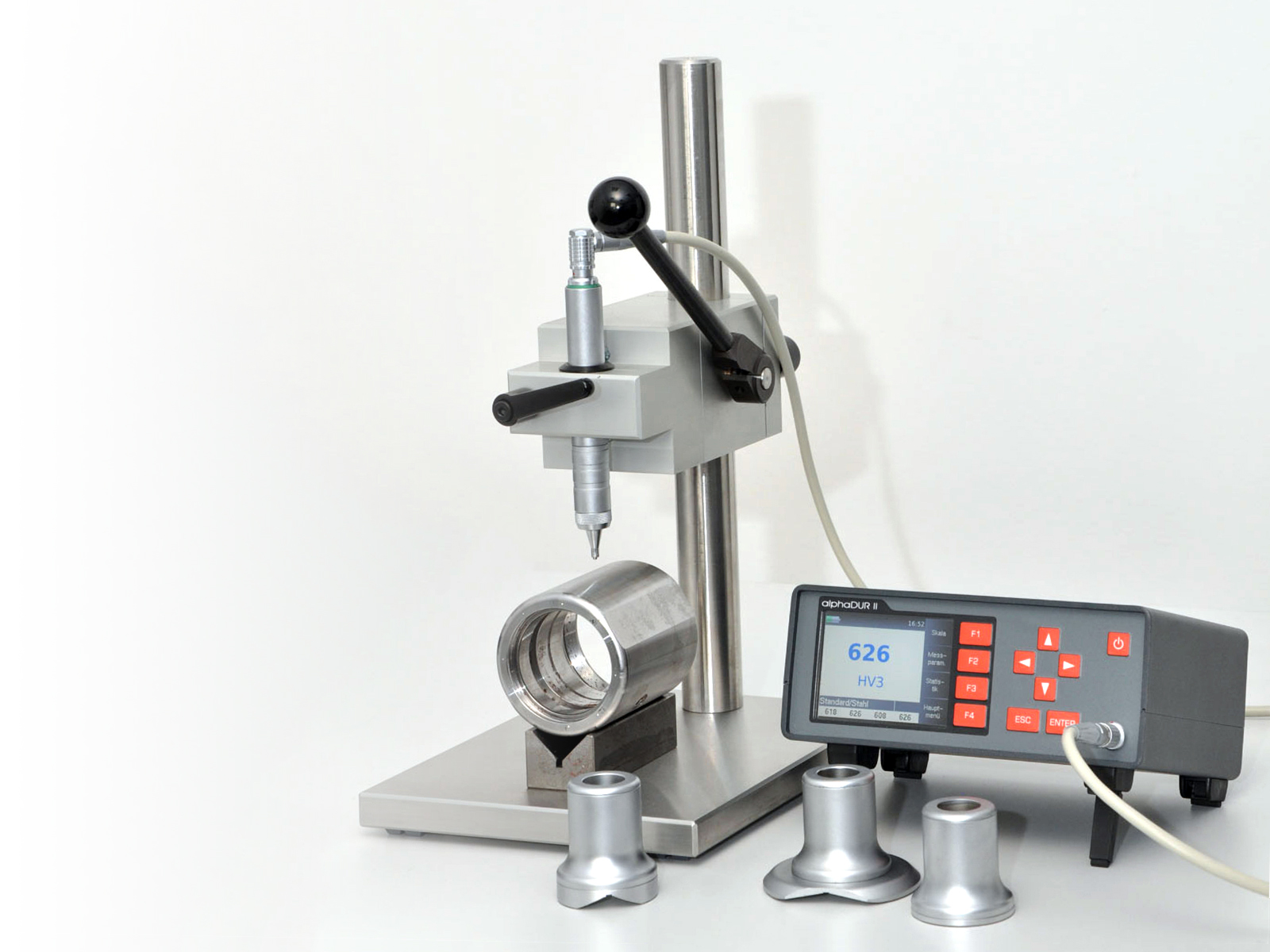 The alphaDUR II has proved its worth as a reliable and versatile hardness tester since many years. It can be employed from simple manual measurements to fully automated production testing. The operation of the alphaDUR II is very easy because all information is shown on the large display. Hardness scale and material can quickly be changed by context-sensitive function keys.