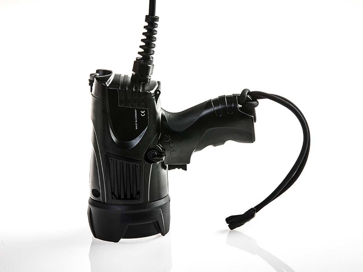 UV Lamp op201 R – ergonomically designed UV hand lamp for on-site and classical applications. With additional orientation light and extra long 5m plug connection cable.