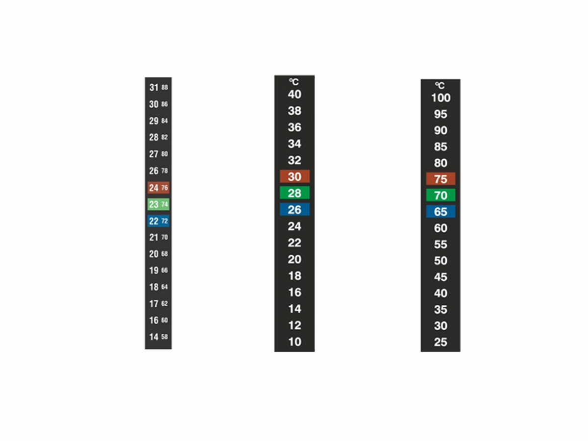 These self-adhesive labels consist of a series of temperature-sensitive elements containing micro-encapsulated liquid thermochromic crystals, TLC, coated on a black backing. Each element changes color distinctly as the nominal temperature is reached.