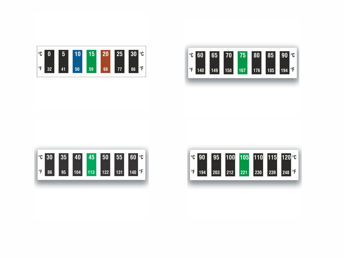 These self-adhesive labels consist of a series of temperature-sensitive elements containing micro-encapsulated liquid thermochromic crystals, TLC, coated on a black backing. Each element changes color distinctly as the nominal temperature is reached.