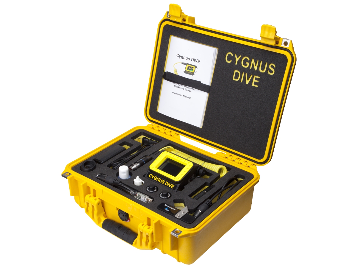 Aparat de măsurat grosimi Cygnus DIVE Underwater Gauge – este destinat uliziărilor in medii subacvatice pentru determinarea grosimilor de pereti cu ultrasunete. Un aparatt robust, care poate fi utilizat cu o singură mână – lăsând o mână liberă în timp ce efectuează măsurarea grosimii cu ultrasunete (UTM) sub apă. Afișajul mare și luminos cu Live A-scan este ușor de vizualizat atât de scafandru, cât și de camera sa – chiar și în cea mai slabă vizibilitate. Având doar două butoane de apăsat, ecranul este foarte ușor de intales printr-un meniu intuitiv și ușor de utilizat. Ideal pentru inspecții UTM de cocă, inginerie civilă, structuri marine, platforme offshore, structuri subacvatice, conducte și echipamente submarine, expertize de tip UWILD sau IWS.