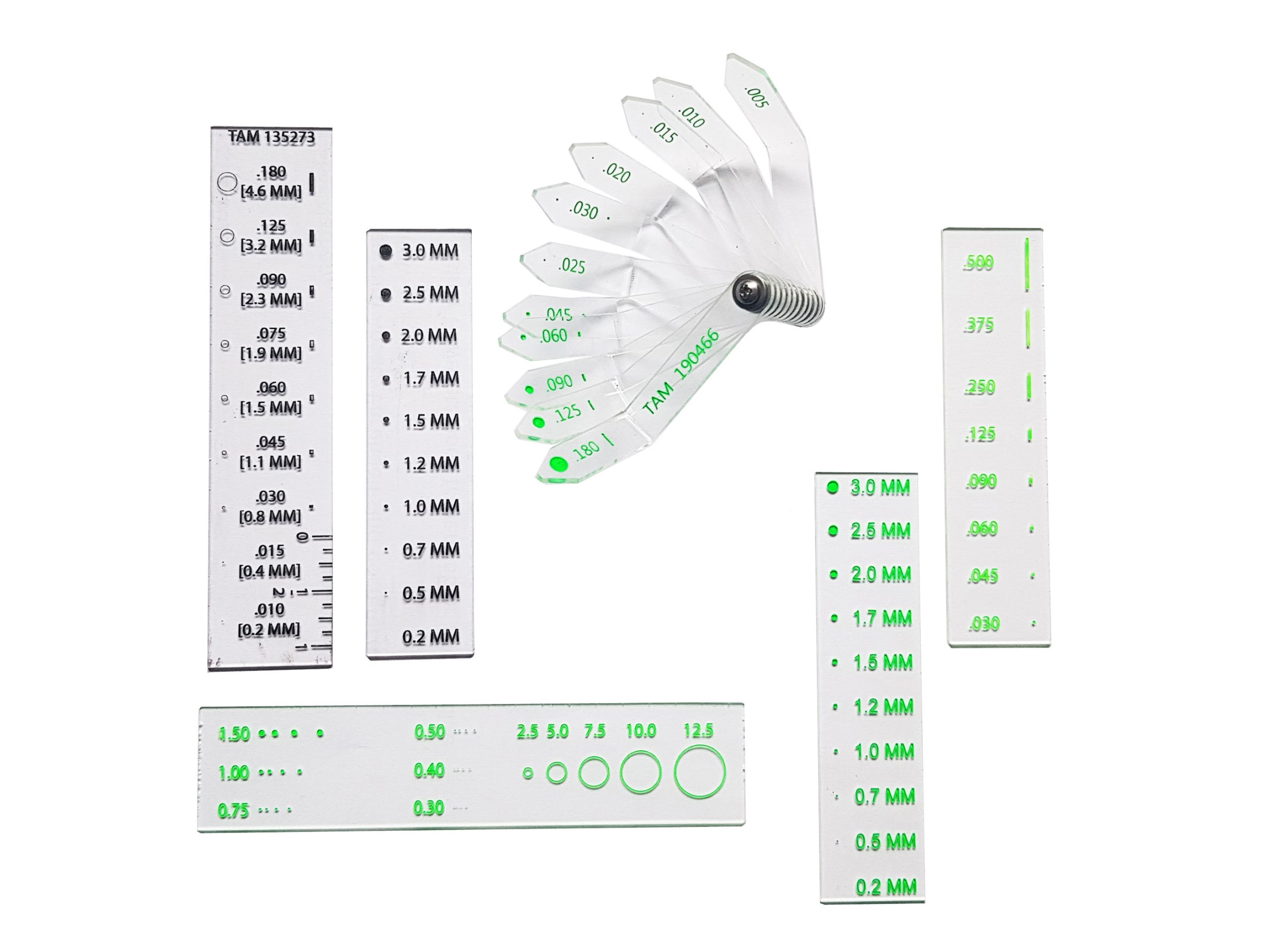 Comparatoare transparente cu puncte, cercuri și linii fluorescente sau negre care se utilizează pentru determinarea precisă a dimensiunilor defectelor.