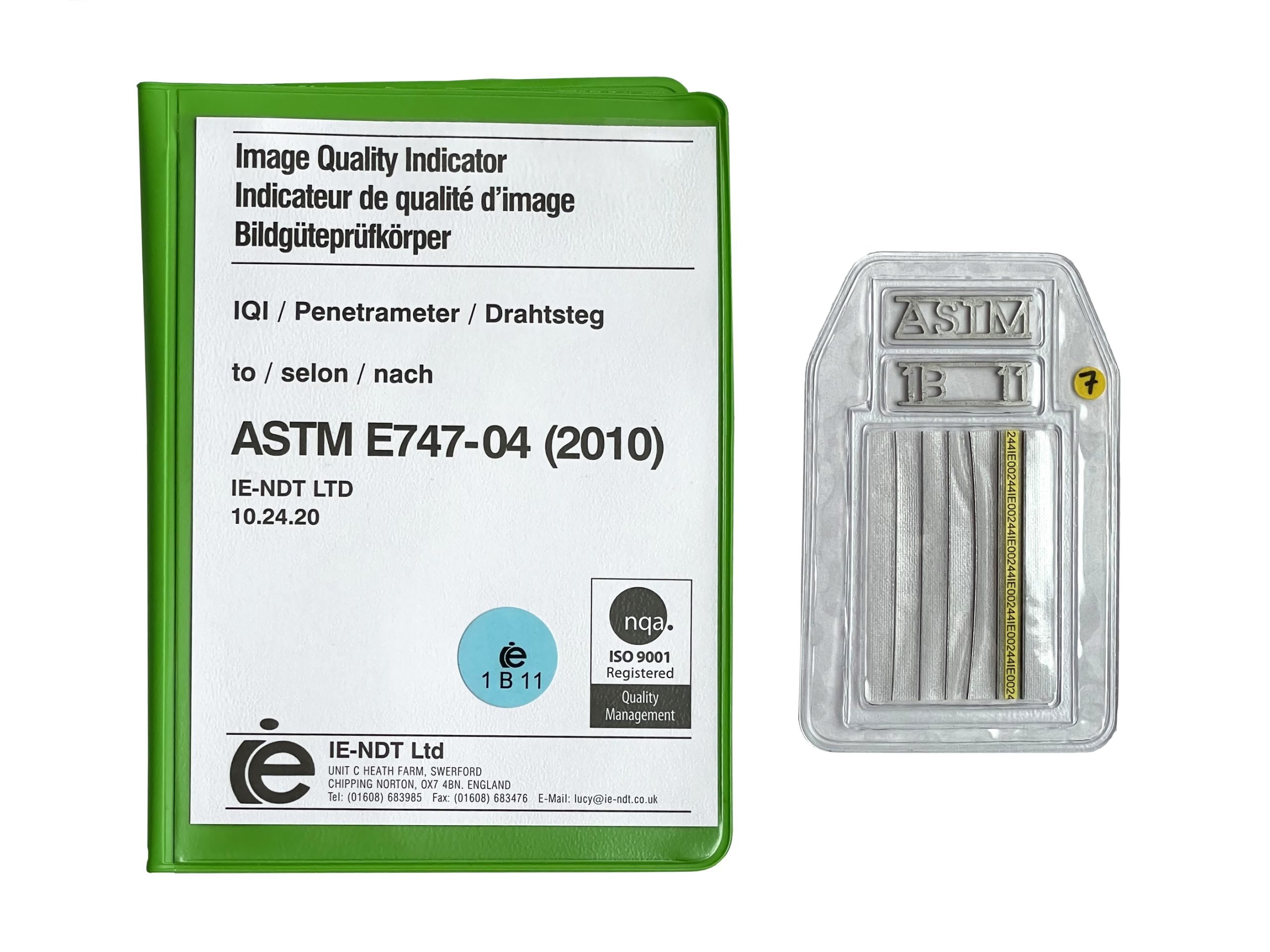 Indicatori de calitatea imaginii ASTM E-747 –  au șase fire paralele, încapsulate în folie de plastic.