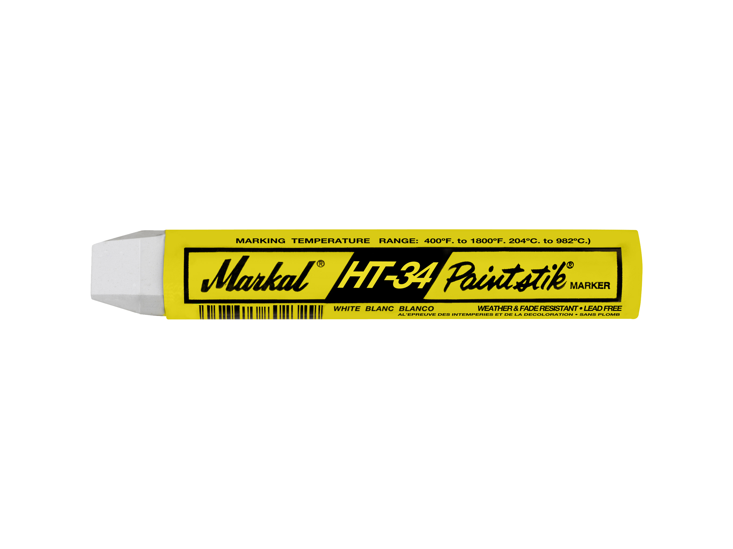 Marker cu vopsea solidă pentru suprafețe fierbinți HT-34 PAINTSTIK – scrie pe suprafețe de oțel încinse de la 204°C la 982°C, cum ar fi bobine, țagle, plăci, bare și lingouri. Vopseaua de lungă durată, rezistentă la intemperii și la decolorare oferă urme albe strălucitoare, identificabile în producția de oțel.